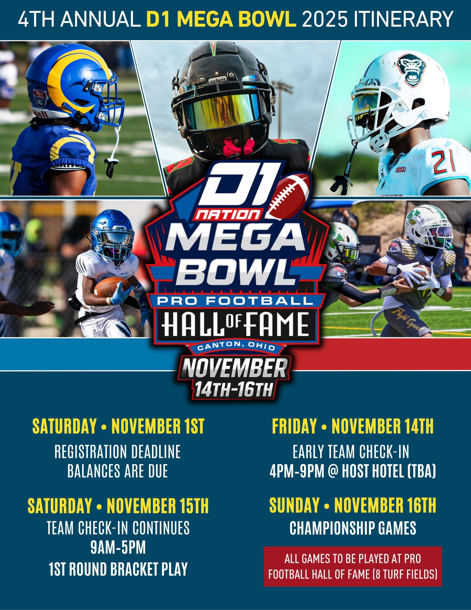 The D1 Nation Mega Bowl takes place at the legendary Pro Football Hall of Fame in Canton. With multiple fields, stadium lighting, and modern amenities for players and families, it’s the ultimate stage to showcase youth talent in the heart of football history.